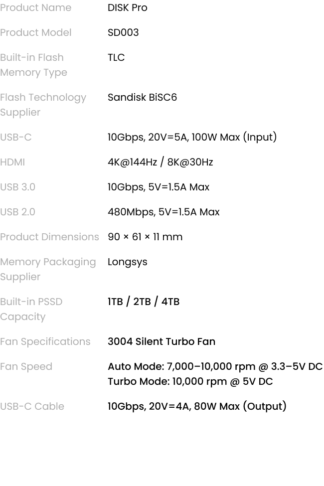 闪盘 Pro 本身仅有信用卡大小(90x61x11mm),重约 150 克,集成 4TB 移动存储、4 端口集线器于一体,传输速率可达 10Gbps,适用于 MacBook、iPhone、Switch 等产品,兼容 MagSafe,支持 HDMI 2.1(4K 144Hz / 8K 30Hz)视频输出、PD 100W 输入 / 80W 输出。